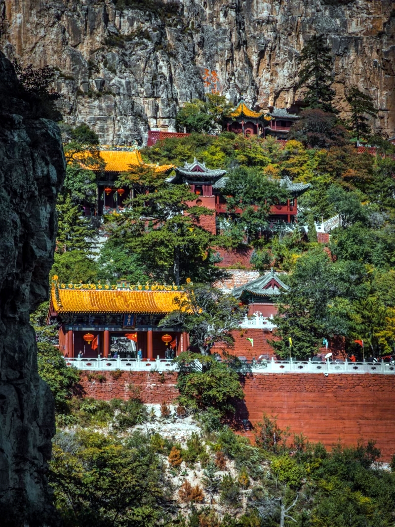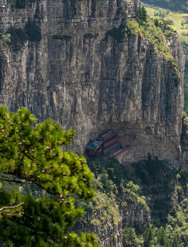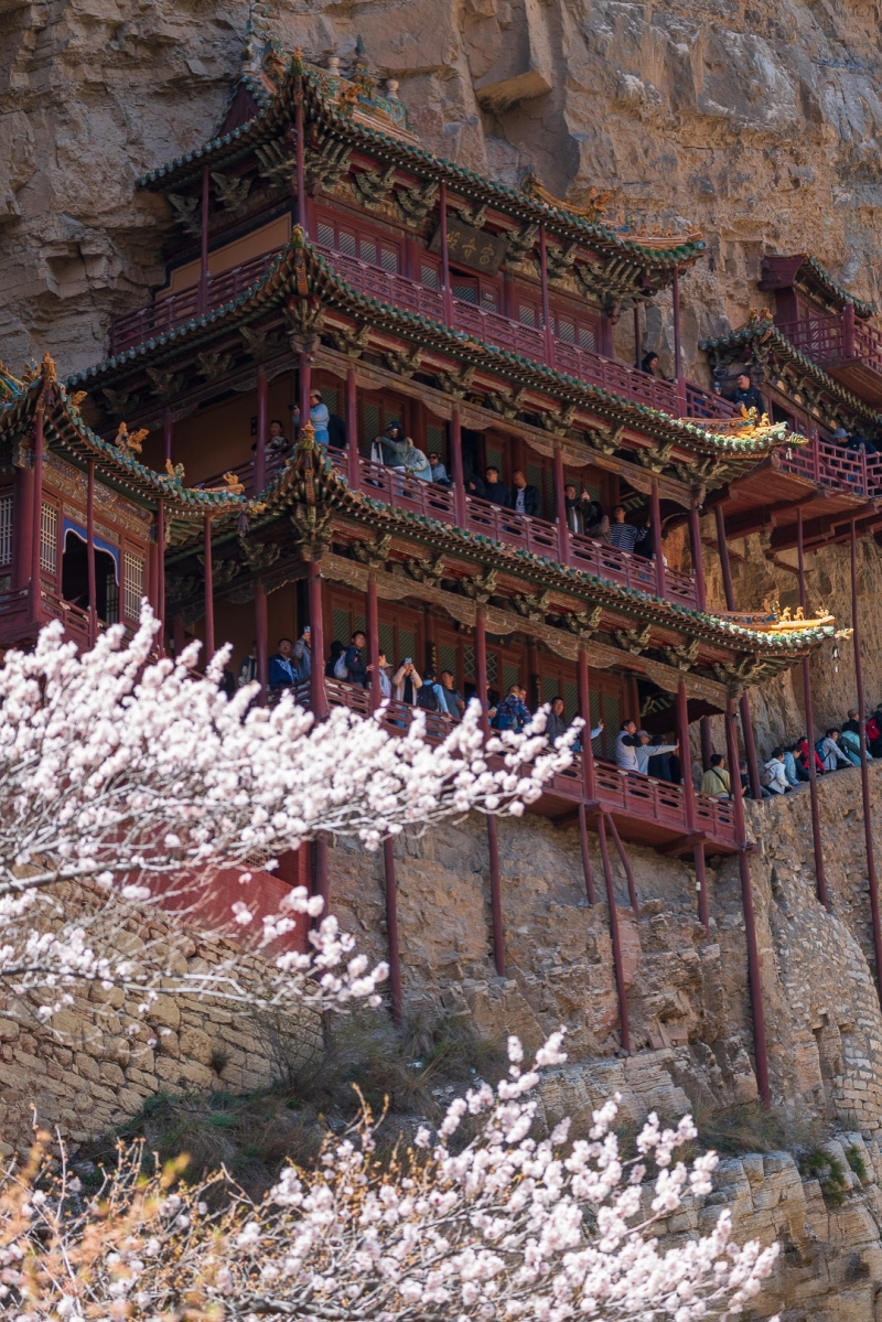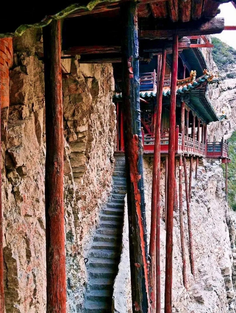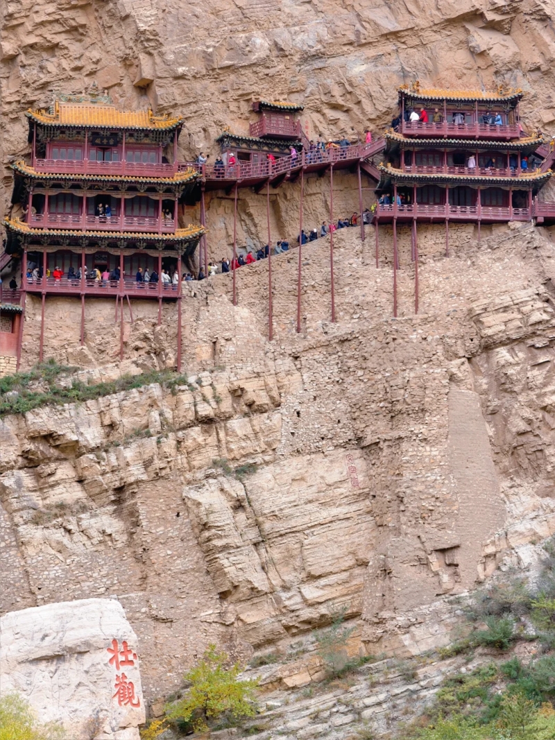 (2)约中午前后抵达悬空寺,看危楼高百尺的壮丽景观,悬空寺就像悬挂在悬崖之上,全寺为木质框架式结构,值得惊叹的是它依靠榫接结构,嵌入崖内而不倒,距今已有1500多年历史,是国内现存最早、保存最完好的高空木构摩崖建筑,诗仙李白观后醉书壮观,徐霞客赞为天下巨观;