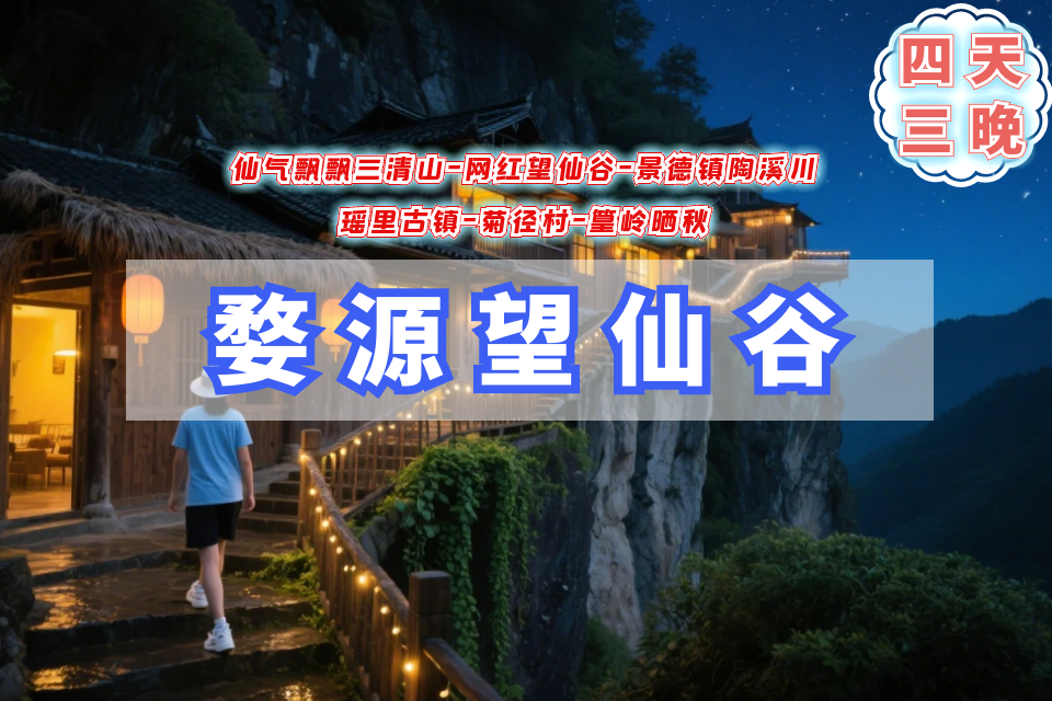 3、门票:三清山门票+往返缆车共240元,卧龙谷55元,婺源篁岭景区门票+索道140元,婺女洲夜场80元,望仙谷门票120元;门票价格供参考,打折证件有效,以景区实际规定为准;