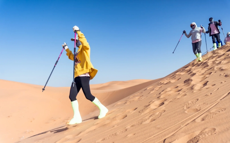 (2)着装:沙漠气温比较炎热,晴天白天气温30度左右,晚上气温在零下5度左右。所以着装搭配建议根据自身状况做好保暖,防晒,防寒工作。为了防止脚起泡,创可贴,发现脚有不舒服的部位赶紧贴上,袜子也要换成专业徒步加厚袜子。