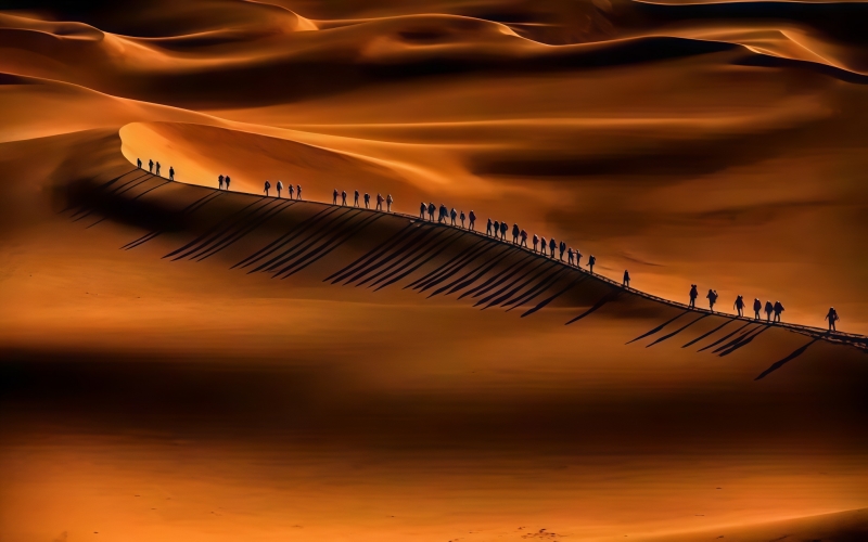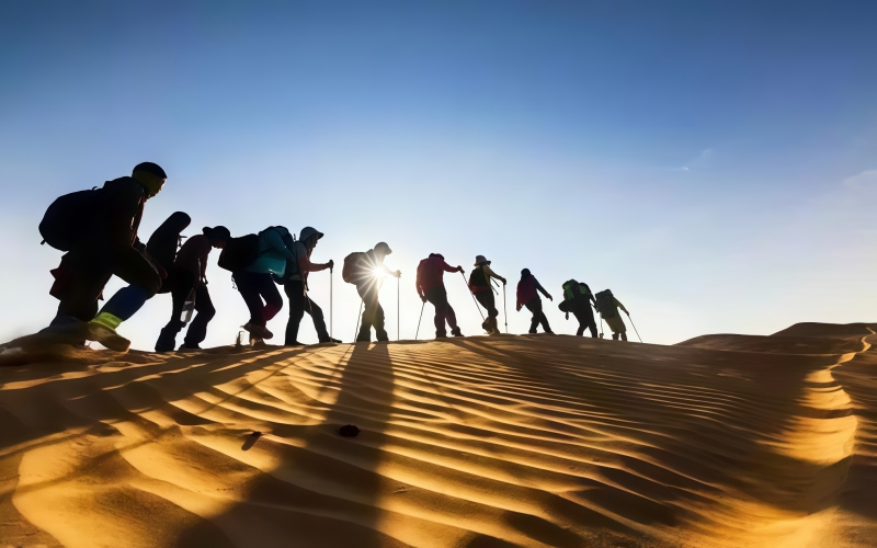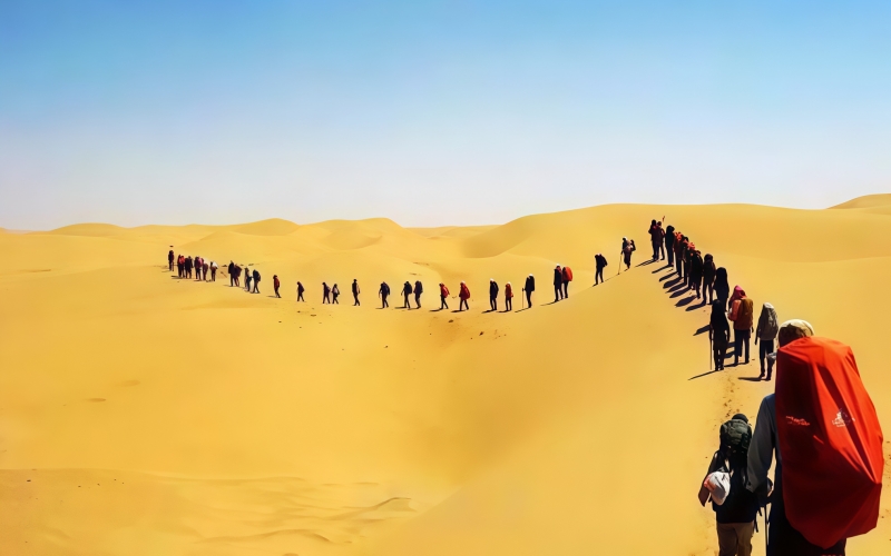 (1)愿意看沙漠日出的自愿早起,欣赏沙漠日出享受难得美妙;(2)大家早起后早餐,之后拔营,继续新的一天的徒步之旅:在沙山中行走要求队员有更好毅力与耐力,跟紧领队的步伐;