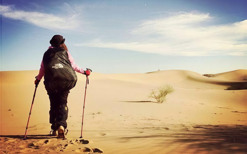 (10)相机使用:沙漠里的细沙会在你不经意的时候沾满你的全身,所以在拍摄时应谨慎的拿出相机,并拍掉手上的沙子,有风的情况下尽量不要使用相机,用密封性好的袋子或者相机套包住相机。(11)要求所有队员及时补充食物和营养,不要因为累了想多休息一会不想动而不补充能量,那样的话后果会很严重,造成体力严重透支,出现安全隐患,如有队员出现心慌、体力不支等情况要及时报告领队。证件:身份证或有效证件必带,打折证件有则带;鞋服:无网眼的徒步鞋,高帮最佳,防风休闲衣物;