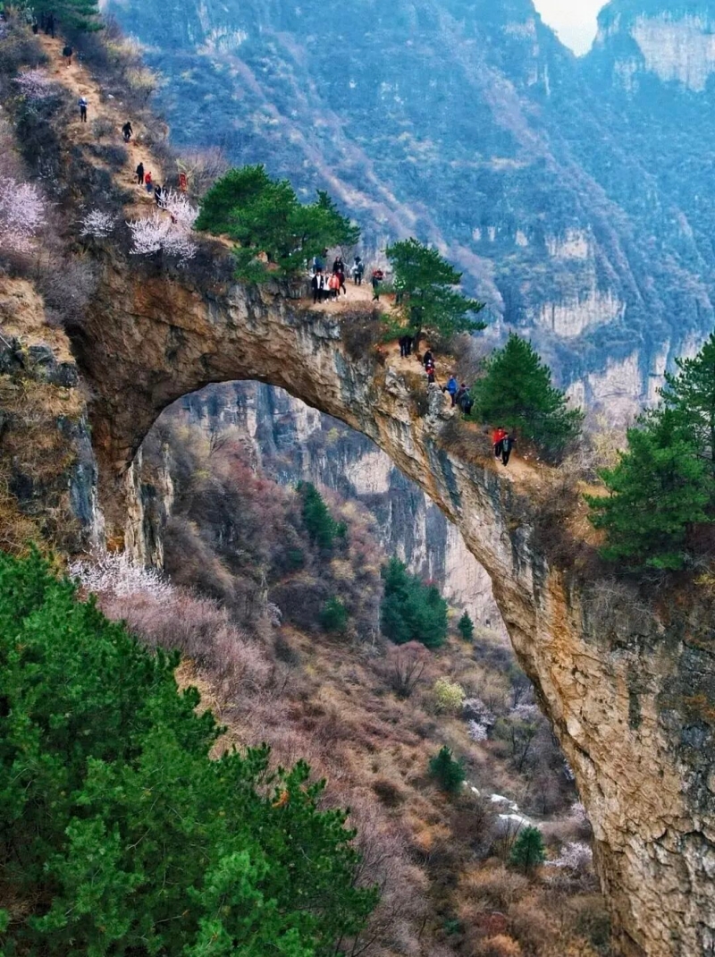 天生桥是穿越途中的重要景观之一,它位于猫路将要上到山顶的东侧,英姑山峰顶,是迄今我国北方发现的最大的天然石拱桥。天桥飞跨于南北两座危崖之间,跨度50米,高200米,宽2-5米,厚度10米以上,呈天然石拱桥状。远远望去颇似一座巨大的山门洞开。其形状、构造与古今中外人造砖石拱桥有异曲同工之妙,真乃鬼斧神工、天造地设的世间奇观。