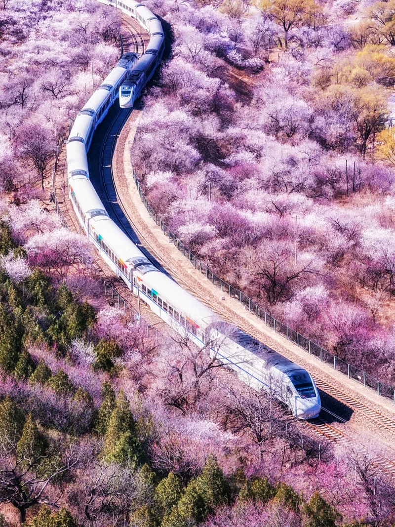 这就是被称作开往春天的列车的S2线,一路上你能看到漫山遍野的山桃山杏花,沿着京张铁路,感受着人字形的曲折迂回,灵魂在这短暂的旅途中会得到进一步升华!这趟开往春天的花海列车一定是这个春天最美的邂逅。