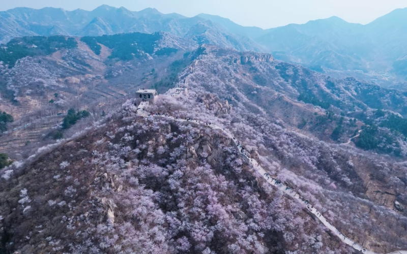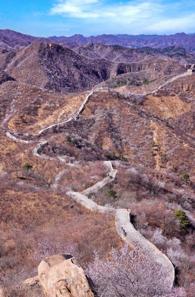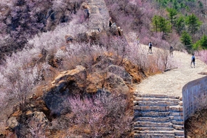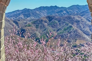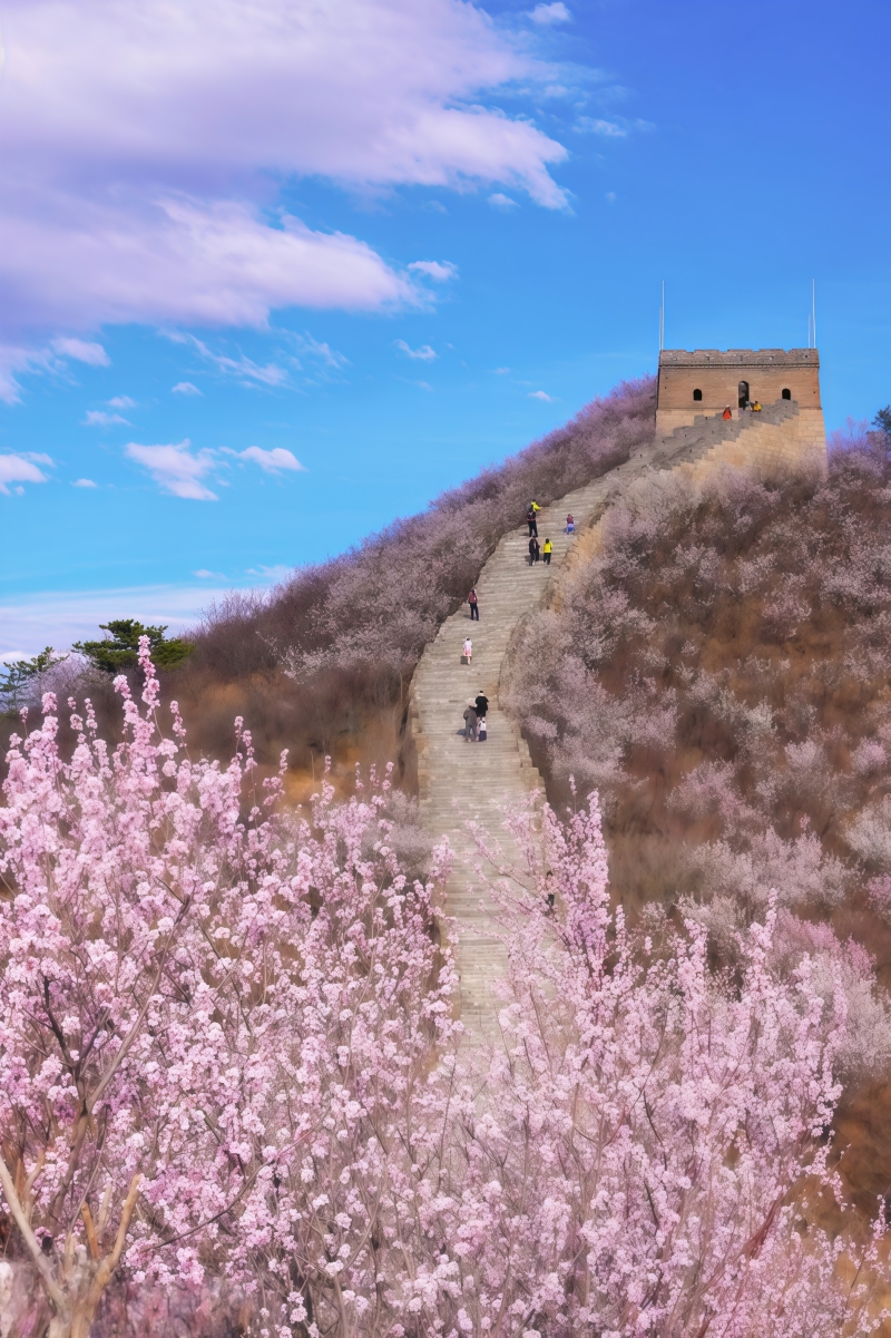 ​​龙泉峪长城绵延于崇山峻岭之上,一直延伸到远方,两侧大山上开满山桃花和杏花。满山遍野的山桃花摇曳生姿,就像上帝之手撒了一把花种子,在春风里发芽绽放。而古长城在山花和蓝天印衬下,不再显得那么苍凉悲壮,更加的神采奕奕,魅力四射。