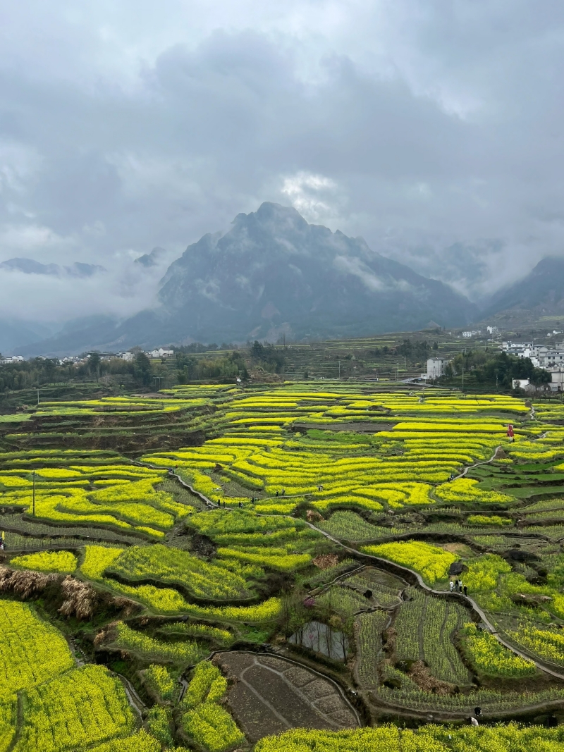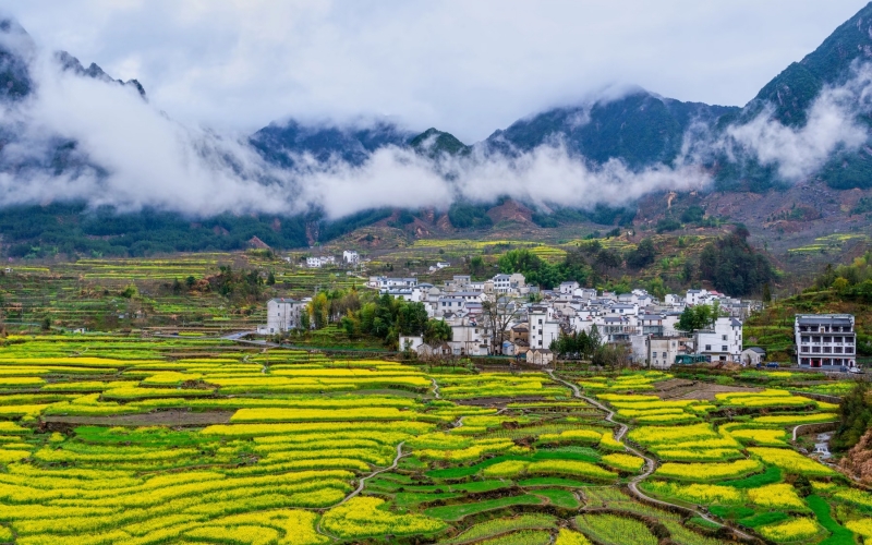 在安徽宣城市绩溪县家朋乡,三月是油菜花的海洋:如链似带、高低错落的油菜花海在山雾中若隐若现,层层叠叠的油菜花梯田顺山势而下,金灿灿的油菜花与徽派古村落交相辉映,构成了一道靓丽的风景线。