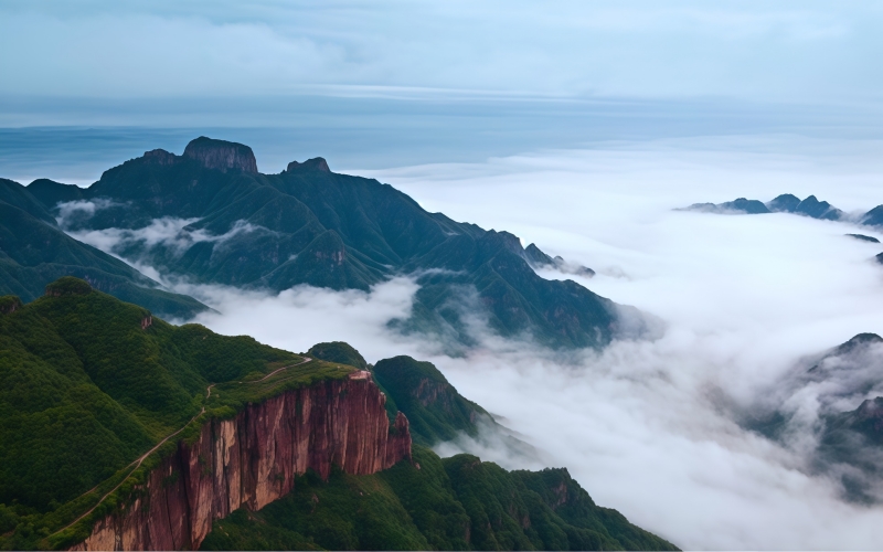 绝壁千仞,云海奔涌,挂壁公路穿崖而过