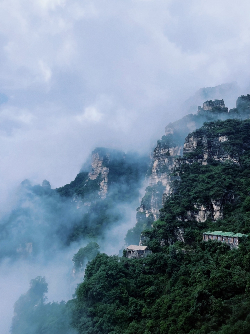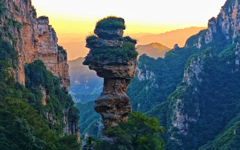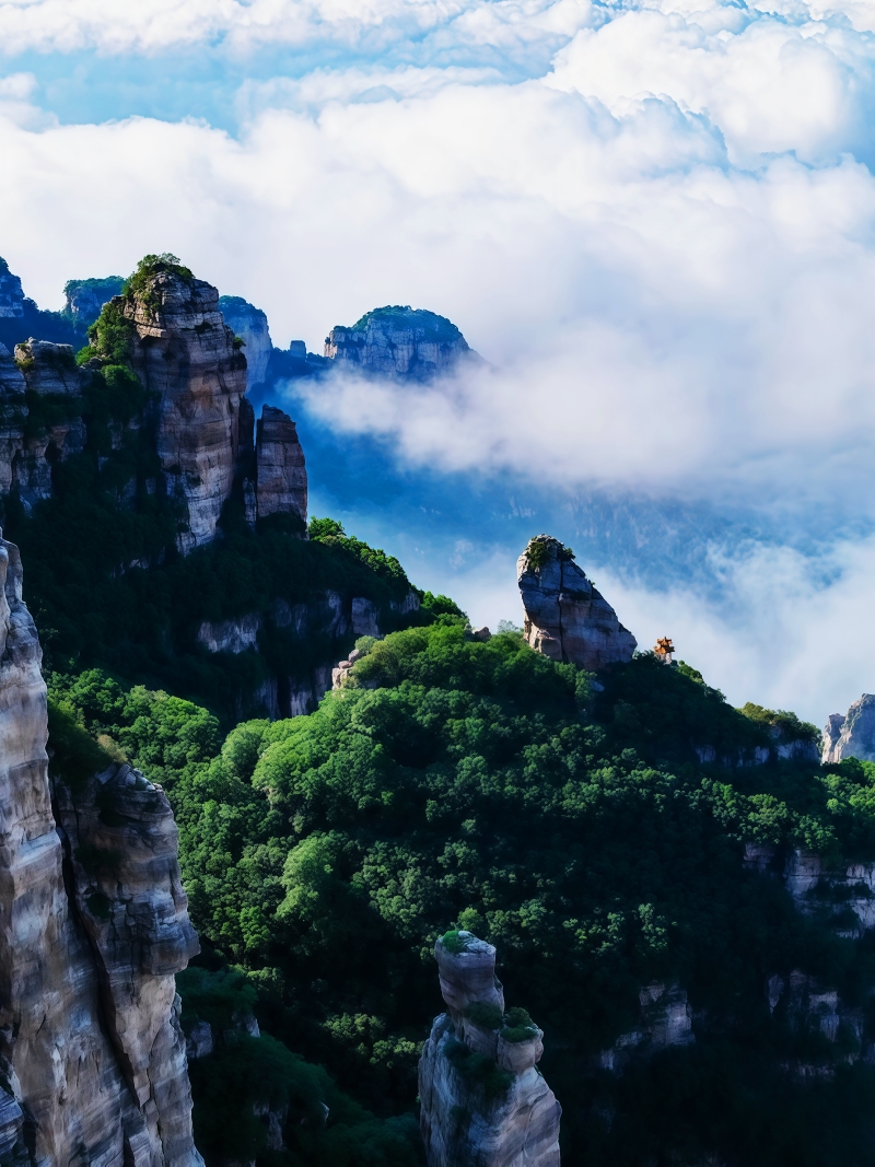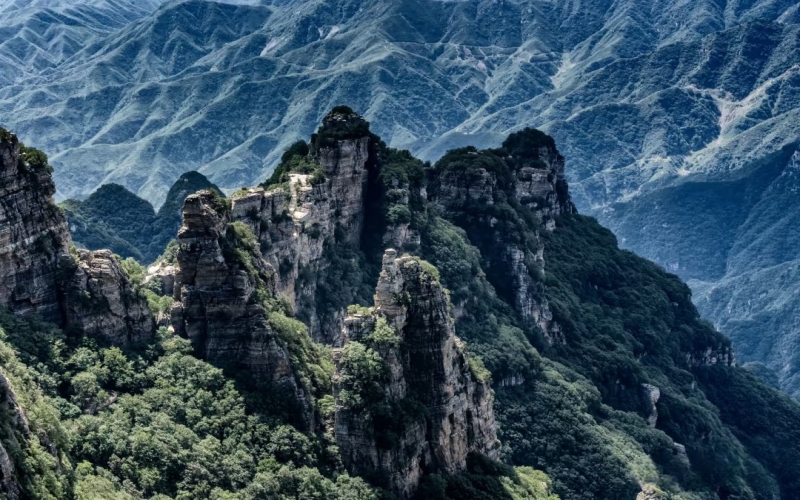 白石山雄踞八百里太行山最北端,山体高大,有“三顶、六台、九谷、八十一峰”。峰高谷深,峰林壁立,落差可达600米,是所谓“雄”;