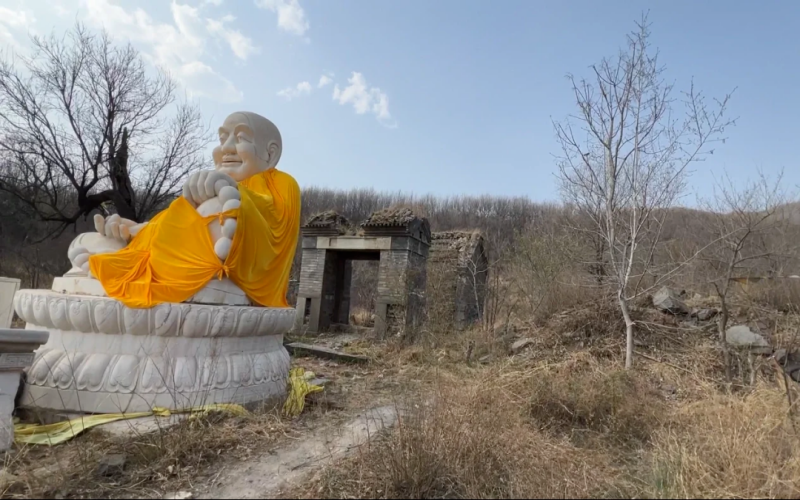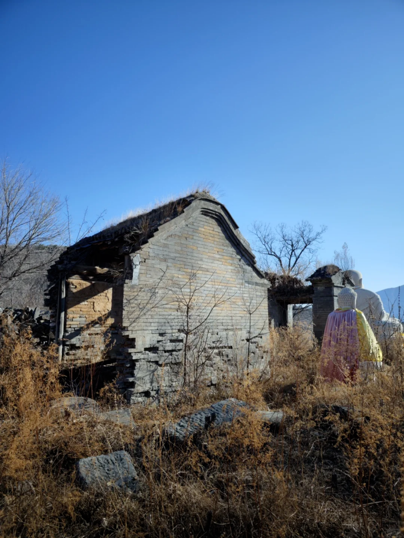 孔雀庵始建于明代后期。坐北朝南,两进院落,北村孔雀庵是明末后人为附会雀儿庵,在潭柘寺周边所建的多座孔雀庵中的一座,也是唯一保存遗迹的孔雀庵。曾经镇上出钱投资了几百万翻修孔雀庵,后来北村拆迁了,成为了烂尾寺庙工程。现在只剩一座山门和快坍塌的殿堂。 遗址处很显眼的弥勒佛和佛祖雕像,还有功德箱就是修复时新建的。